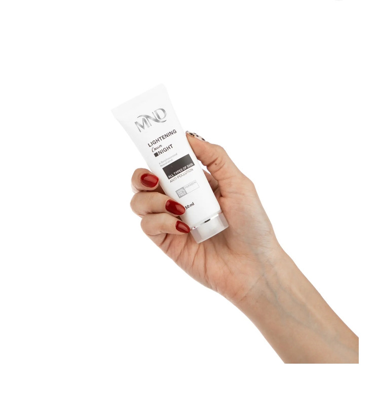 یکی از روشهای مدیریت لک و تیرگی پوست، استفاده از محصولات روشنکنندهای است که حاوی ترکیبات لایهبردار هستند. این محصولات به کم شدن سریع لایههای پوست کمک کرده و تولید ملانین را کاهش میدهند تا پوست روشنتر شود. برای تثبیت کاهش تیرگی پوست، استفاده از محصولات روز و شب روشنکننده توصیه میشود تا فقط تولید ملانین کنترل شود و پوست فرصت کافی برای ترمیم سطح خود را داشته باشد. کرم شب روشنکننده پوست MND حاوی 4-بوتیل رزورسینول و عصاره پوست درخت کاج سفید است که از ترکیبات روشنکننده بسیار مناسب پوست هستند و در کنار رزوراترول، که کنترلکننده تولید و جابجایی ملانوزومهاست، میتوانند تولید و جابجایی ملانین در پوست را کنترل کنند. این محصول به دلیل بهرهبری از عصاره جو، به تسریع تشکیل لایههای جدید بدون ملانین اضافی در سطح پوست کمک کرده و پوستی یکدست و روشن را به ارمغان میآورد. به دلیل تأثیر آلودگیهای محیطی پیرامون انسان که میتوانند باعث التهاب و قرمزی پوست شوند، از عصاره برگ انگور نیز در این محصول استفاده شده تا ذرات معلق و... باعث تحریک و ناراحتی پوست نشوند و محافظت درستی از پوست در برابر آلودگی انجام شود.